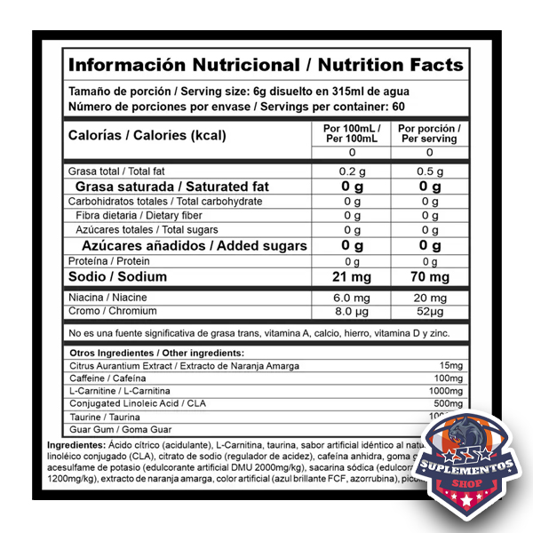 Fórmula bien compuesta: incluye varios ingredientes con respaldo científico (CLA, carnitina, cafeína, naranja amarga, cromio) para apoyo en pérdida de grasa y metabolismo. Versatilidad: al venir en polvo y con dosis relativamente estándar, permite ajustarse según rutina y meta.