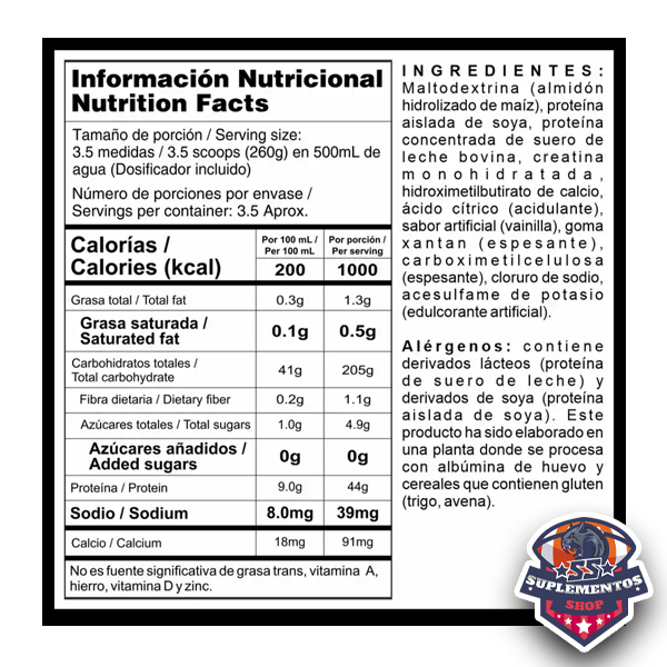 La dosis de calorías por porción es muy elevada (hasta ~1 000 kcal) en la versión de ganancia — por tanto no es apropiada para quienes buscan definir o mantener peso sin ganancia. Su consumo sin un programa de entrenamiento adecuado (resistencia, fuerza) y sin supervisión nutricional puede llevar a resultados subóptimos.